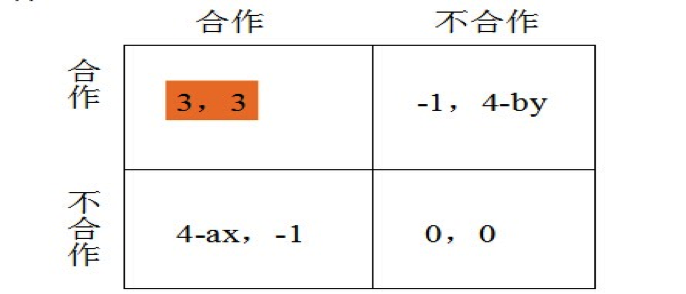 我們先假定不去考慮圖中的a和b。只有這個懲罰y和x足夠大,人們才可能去合作。在這里,只要y大于1,x大于1,當你預計你不合作之后,帶來的好處要扣除你要承擔的懲罰,你覺得不如合作的話,你就會選擇合作。這個時候這種法律就可能使得合作成為納什均衡。