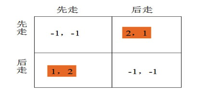 我們再想象,如果你碰到一個人,你預期這個人會先走的話,你的最優選擇是什么?后走,你讓他一下。反過來說,你預期他后走,你的最優選擇是什么?先走。一個人先走,另一個人后走,無論哪一個人先走,哪一個人后走,都是納什均衡,在這個博弈當中,有兩個納什均衡。