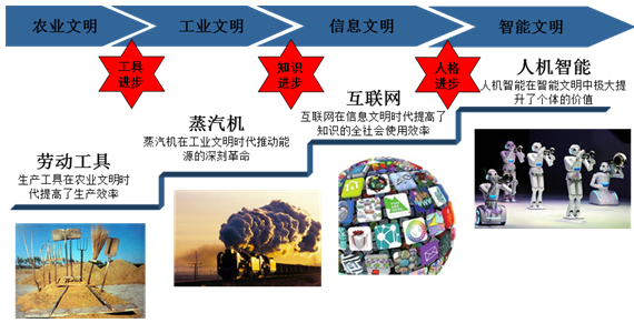 回答這個問題之前,先了解一下筆者對技術文明進化的研究。從下圖我們可以看到:農業文明時期,人類是以發明工具來提高生產效率;工業文明時期,人類科技的主要變革是利用化石能源推動蒸汽機;互聯網時期,人類通過知識進步提高了萬物的連接和使用效率。那么到了人類文明的下一個階段,“智能文明”注定是通過提高個體價值和創造全新個體來從更高的維度提高社會生產力。人機智能——就是人類科技文明的一個終極歸宿。